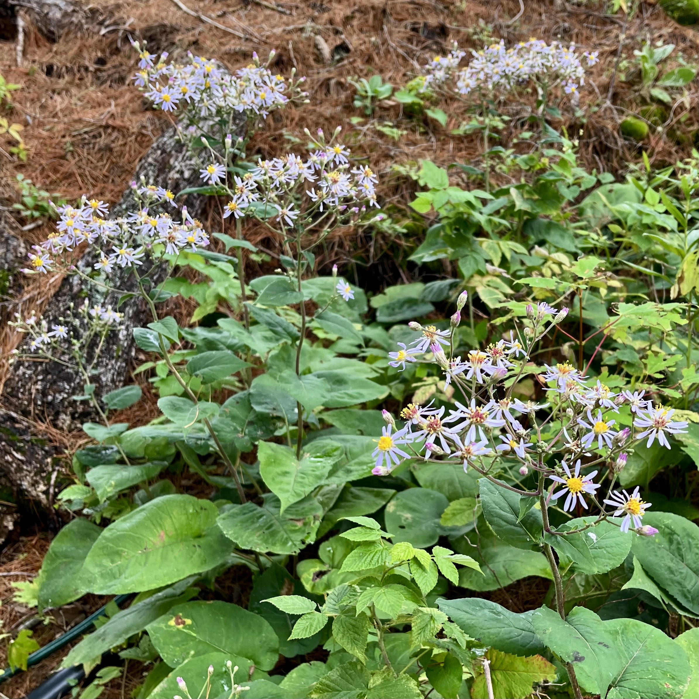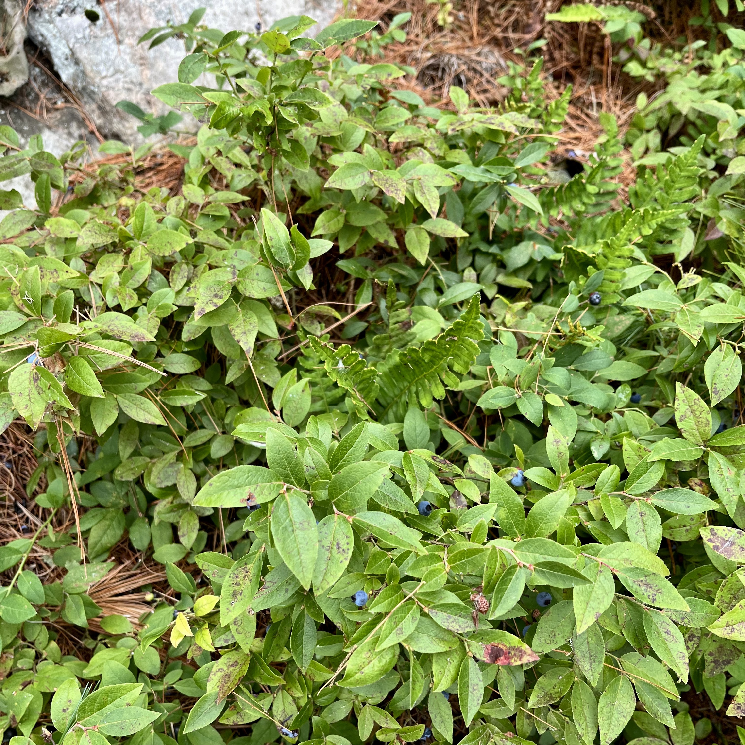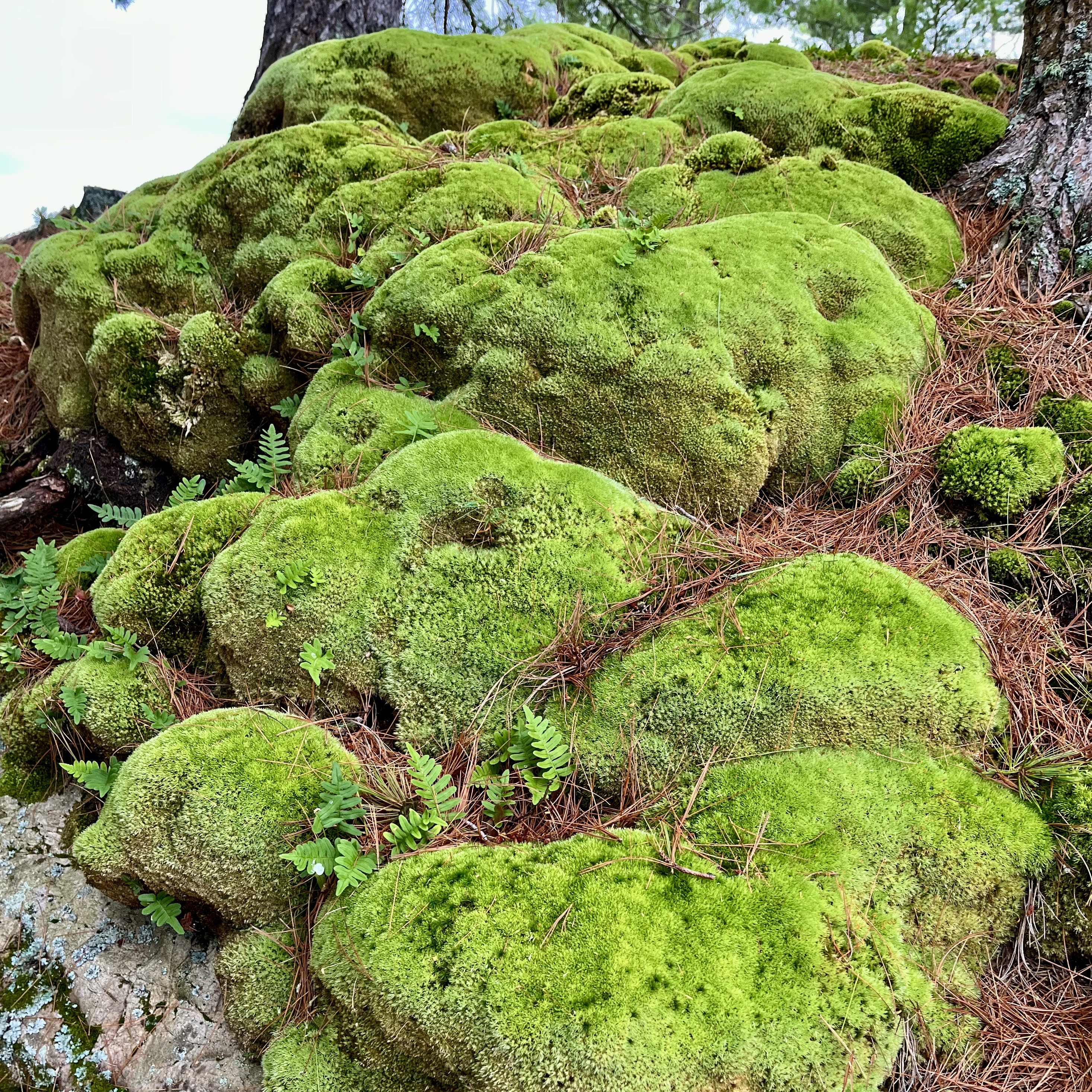 This whole area is one large chunk of granite, and each of the islands that formed is also just a large outcropping of granite. For millennia, small bits of organic matter and seeds would get deposited on these islands and small plants would grow. Then larger plants would grow and they would leave more organic matter, until there was enough to support early species of Birch or Pine. After many cycles of growing and dying, enough organic matter would build up to create a layer of soil. The mulch everywhere is pine needles, as you can see. I wish I had my meter as the soil pH is probably around 4.5. Way too acidic to grow good vegetables, which is why my friend typically grows in a raised bed with potting/garden soil.