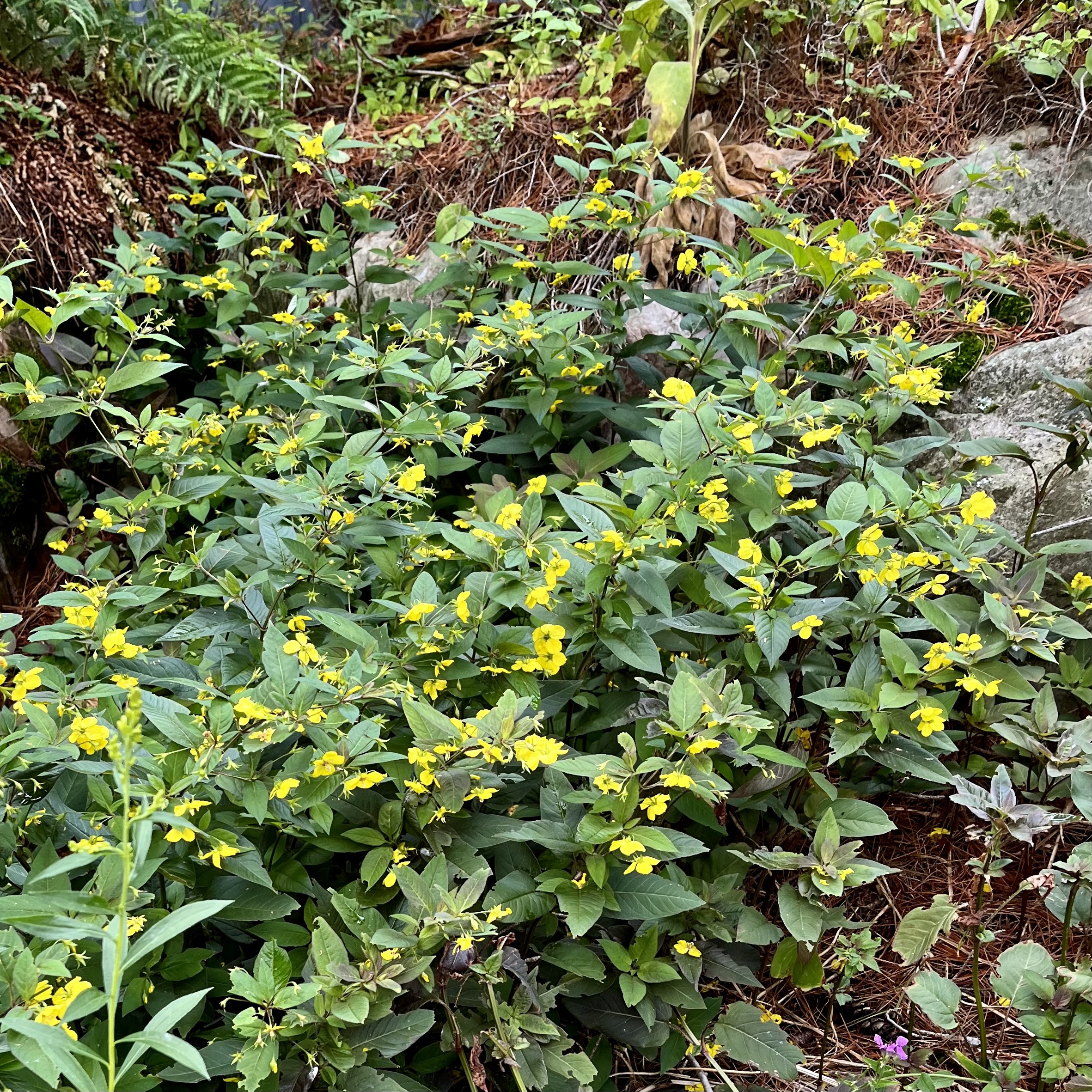 Fringed Loosestrife (Lysimachia ciliata) first and Big-Leaved Aster (Eurybia macrophylla) second. This Loosestrife species is a great ground cover for shade to moist sun, but likes moist soil. We have many great Loosestrife species, despite the bad reputation of the invasive Purple Loosestrife. The Aster is a classic woodland plant in the shade with moist soil that has a nice dense foliage that can work as a ground cover too.