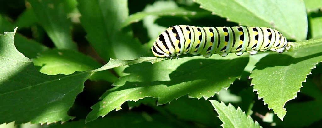 The caterpillar above will soon be a Black Swallowtail Butterfly. They lay eggs, grow and eat exclusively on plants in the Carrot Family, and you will often see them on your Parsley or Dill plants, eating away. This one is munching on some Golden Alexanders (Zizia aurea.) It will shortly pupate and be a butterfly in a few weeks. They won’t kill your plants, and will be flying away soon. This is why we need to be careful about pulling out pesticides, when we see plants being munched on, as it might be a friend!