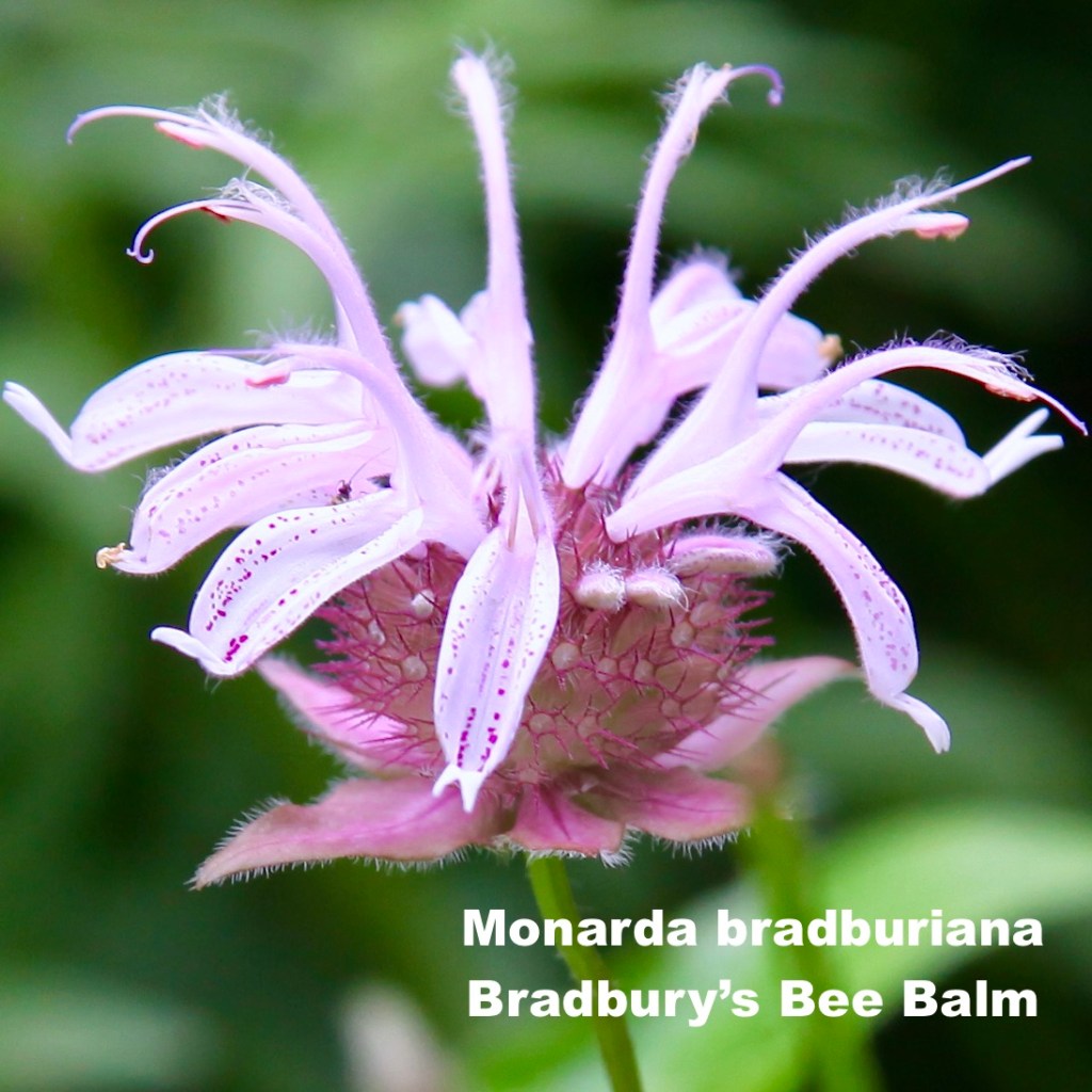 SOLD OUT Bradbury’s Bee Balm (Monarda bradburiana) – Classic whorled flower of Bee Balm on a shorter plant with foliage that stays clean all year. Beautiful pink/purple flowers in early summer. Prefers sun and average/dry soil. Plant height 2’ – Plant width 1.5’ – Seed Count = 25 or so